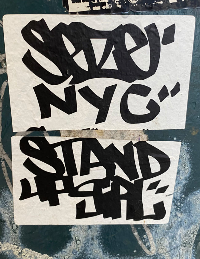 Seze and Stand Up Girl are street artists based in NYC. Their main works are handwriting graffiti and illustration stickers.