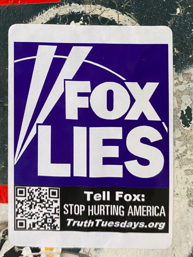 “Fox Lies” sticker was designed by an anti Fox News organization called Truth Tuesdays.