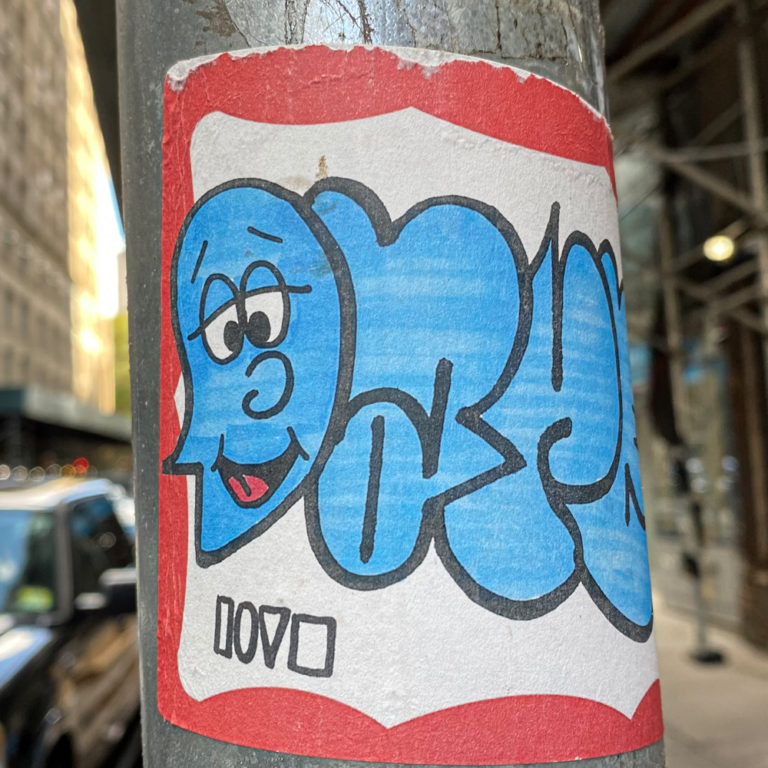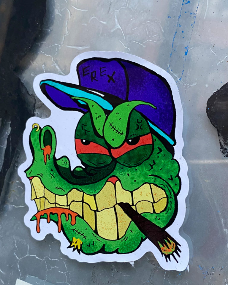 This sticker of a grumpy crocodile and a word of EREX on its hat can be found near 22 Orchard St.